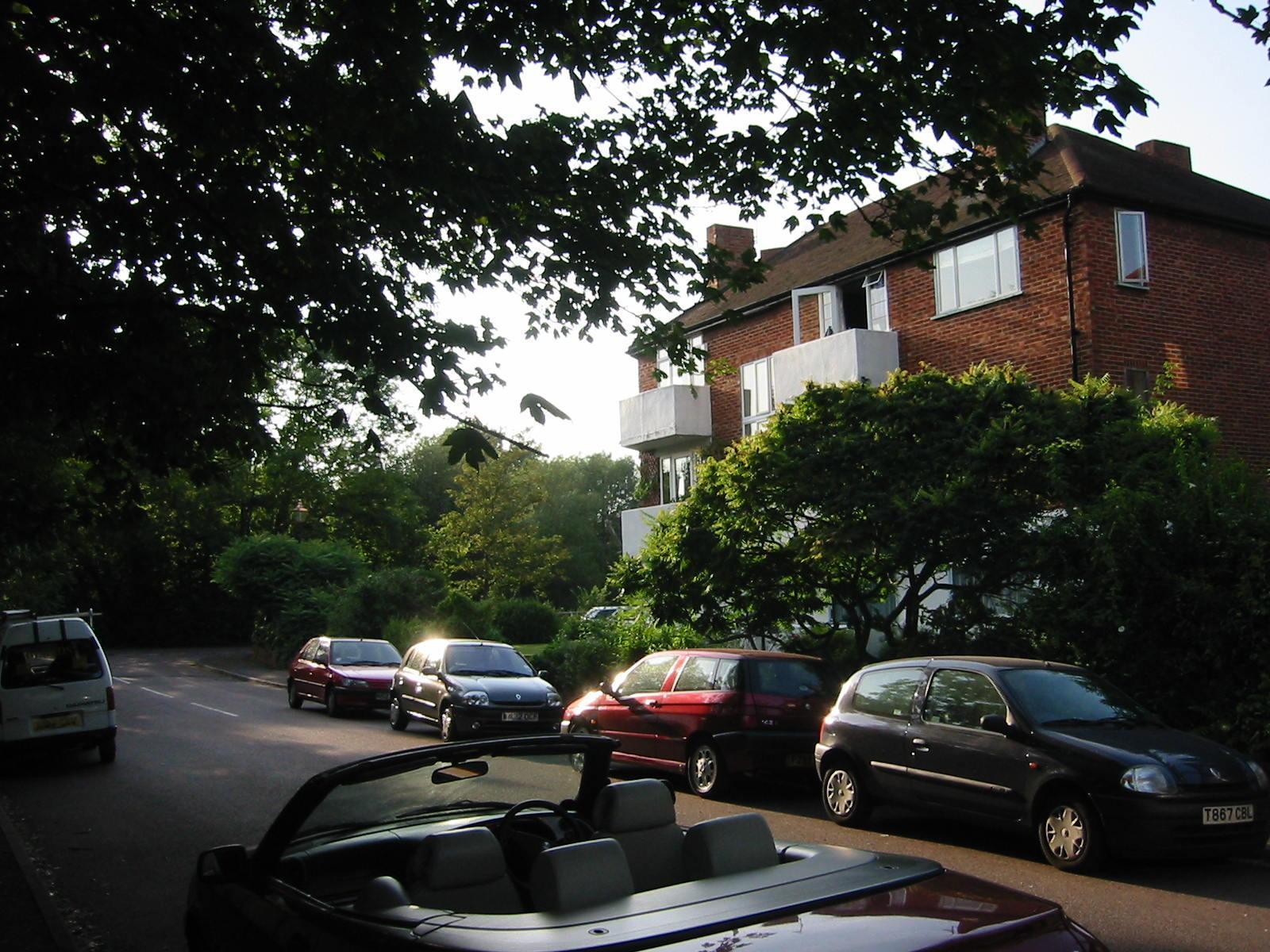 Road with parked cars and overhanging trees. River Court flats on the right.