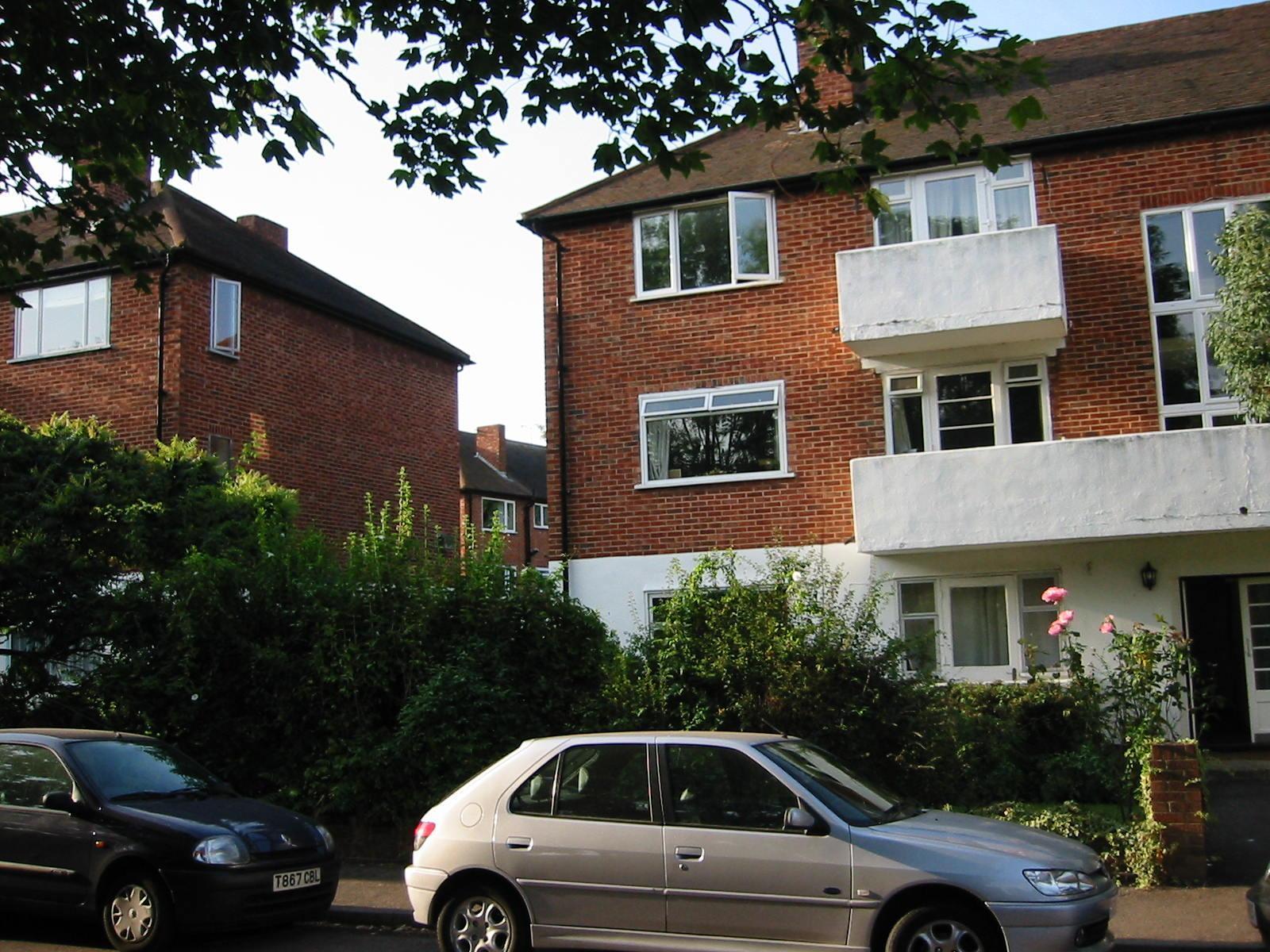 River Court flats. Cars parked in road.
