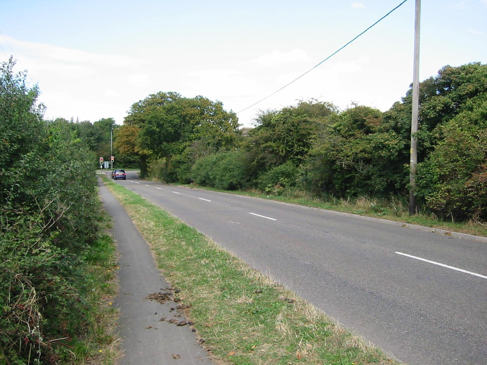 Looking north on Marsh Lane. Bushes and footpath on left. Traffic lights at junction in the distance. Bushes and trees on far side of road. Telephone pole beside road on right.
