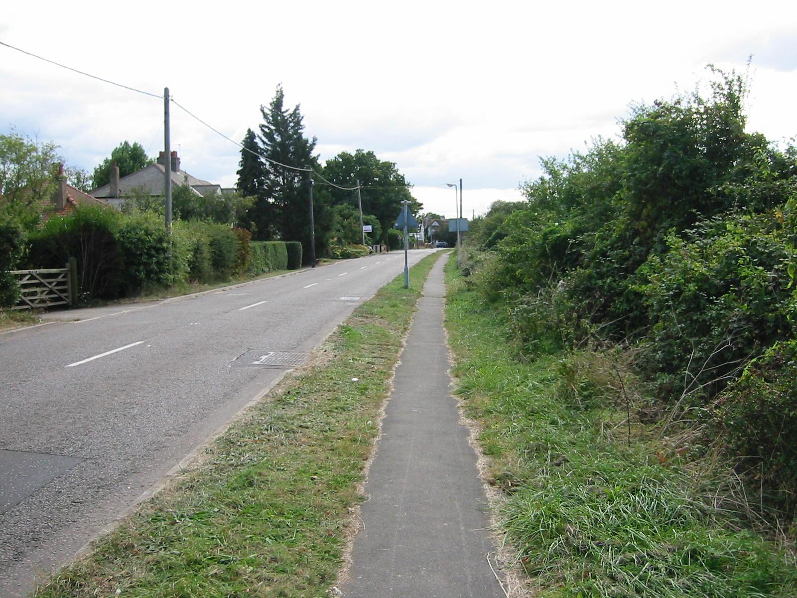 Road on left with bushes and house roofs in the distance. Grass verge with footpath. Bushes on right.